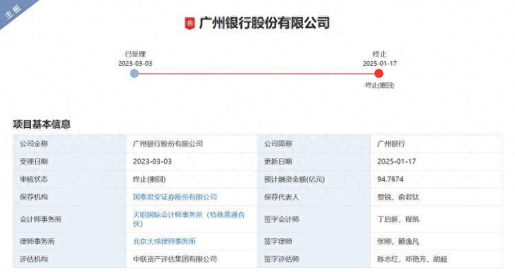 2024年8月27日,因广州银行需更换申报会计师,深交所中止其发行上市审核。2024年9月30日,广州银行再次遭遇财务资料已过有效期的问题。2024年11月1日,广州银行股份有限公司已更换申报会计师。